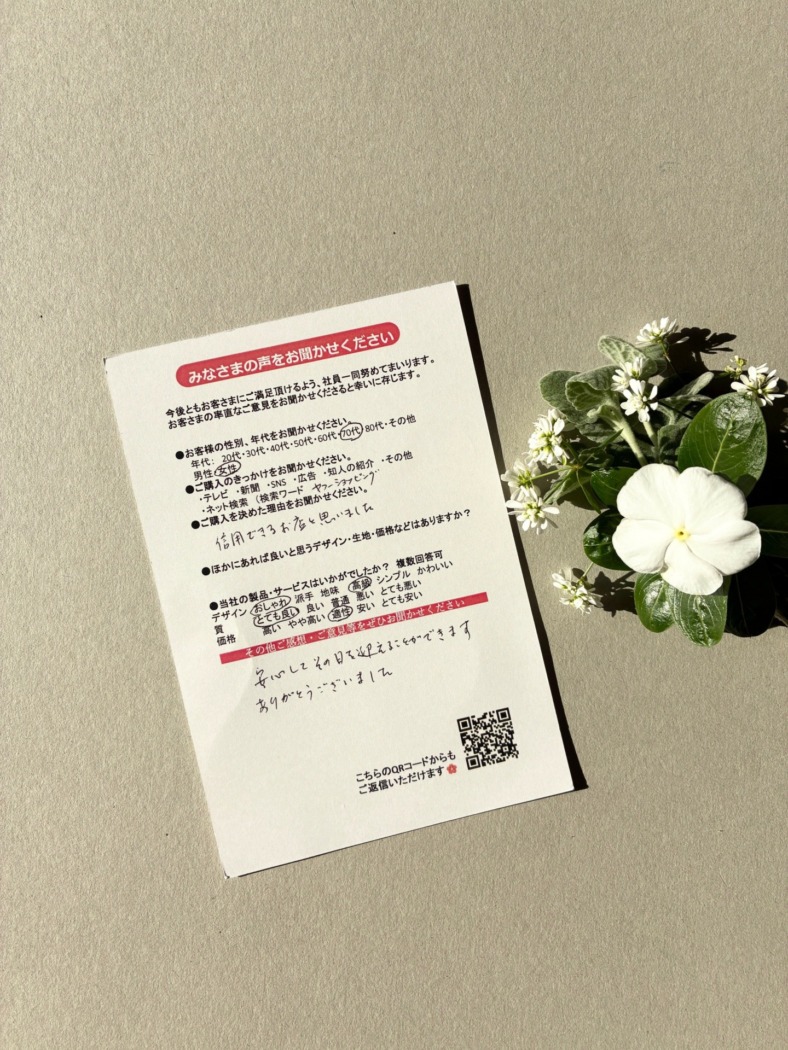 お客様アンケートのご協力ありがとうございます。さくらさくらをお選びいただき心より感謝申し上げます。くれぐれもお身体お大切にお過ごしくださいませ。 心を込めて、一言お礼まで。